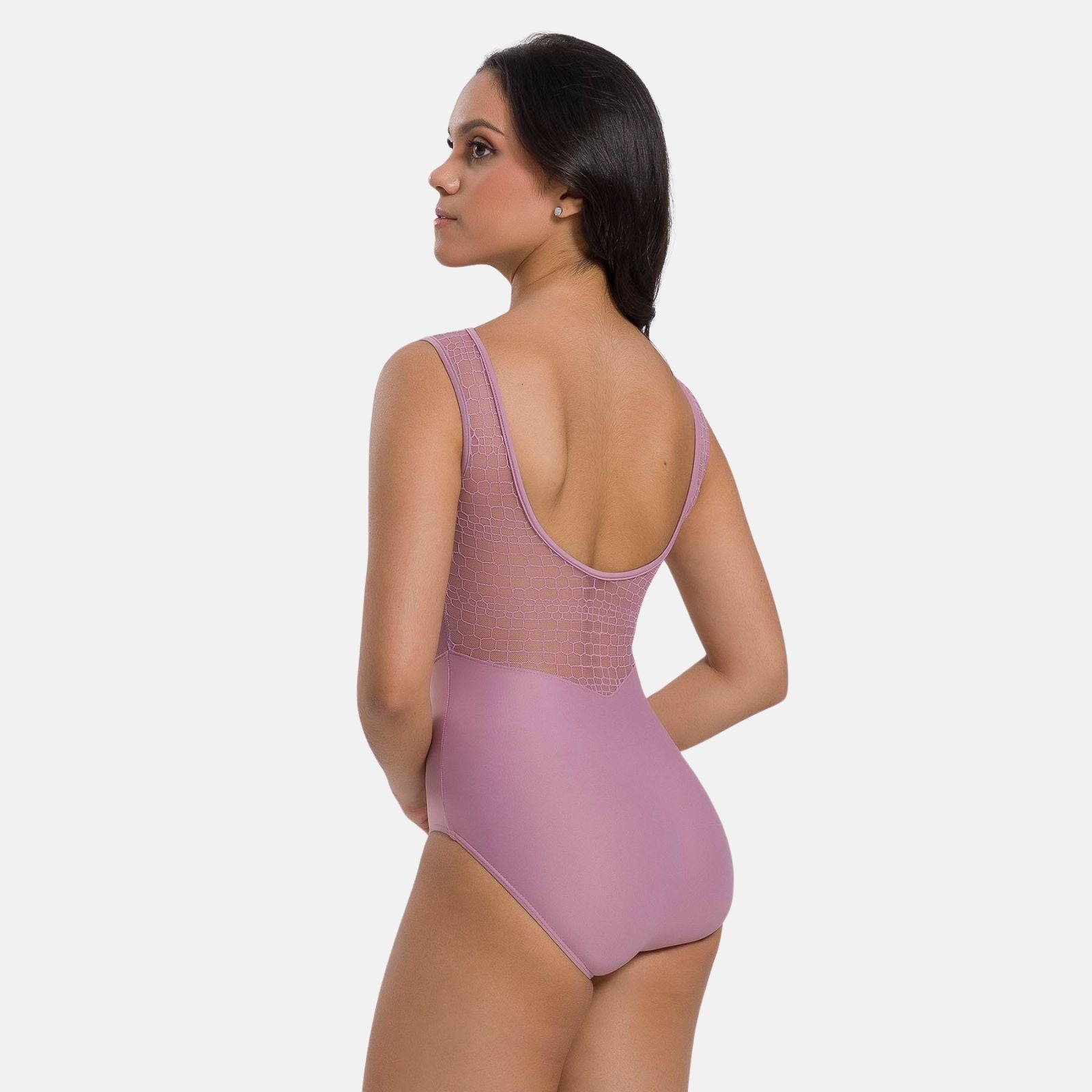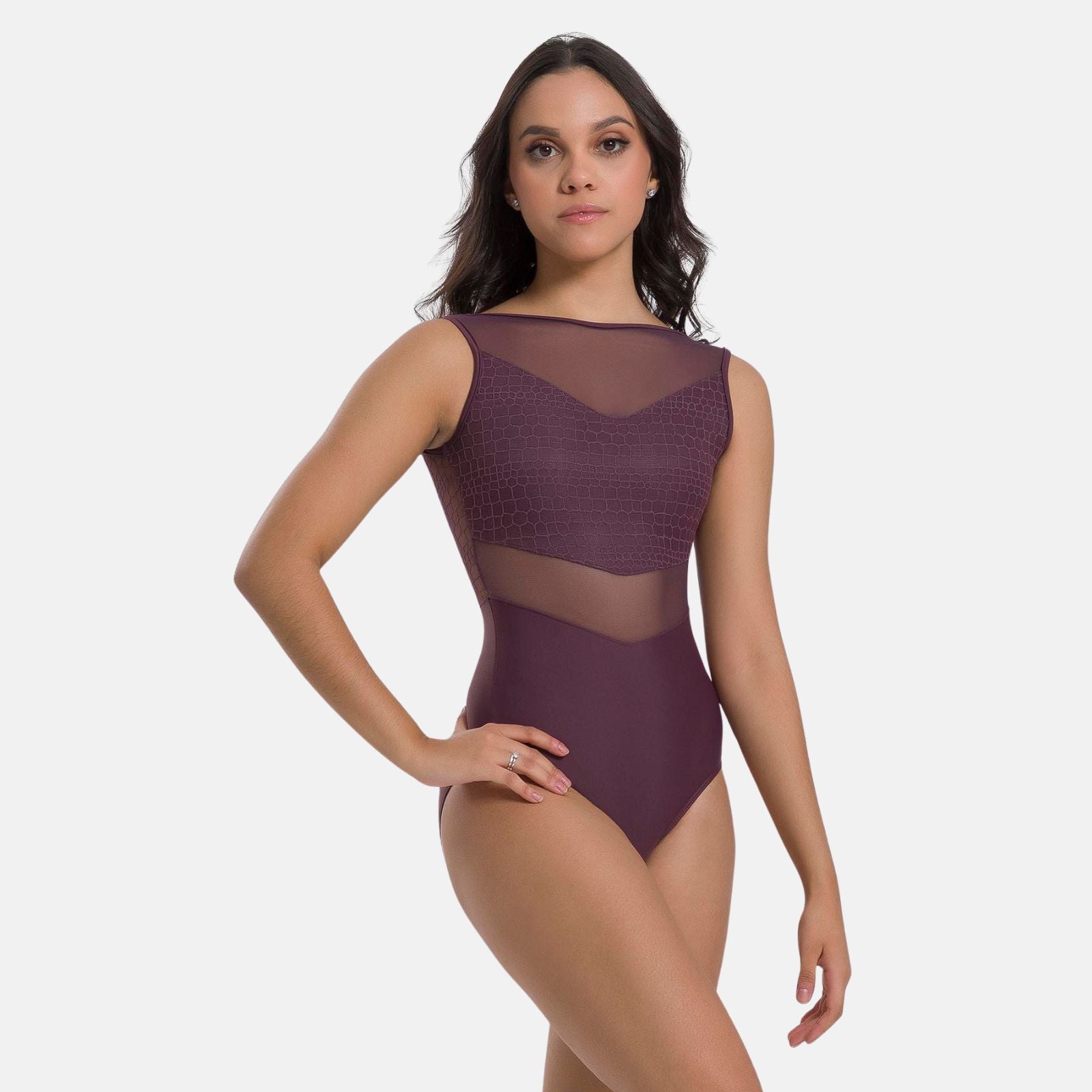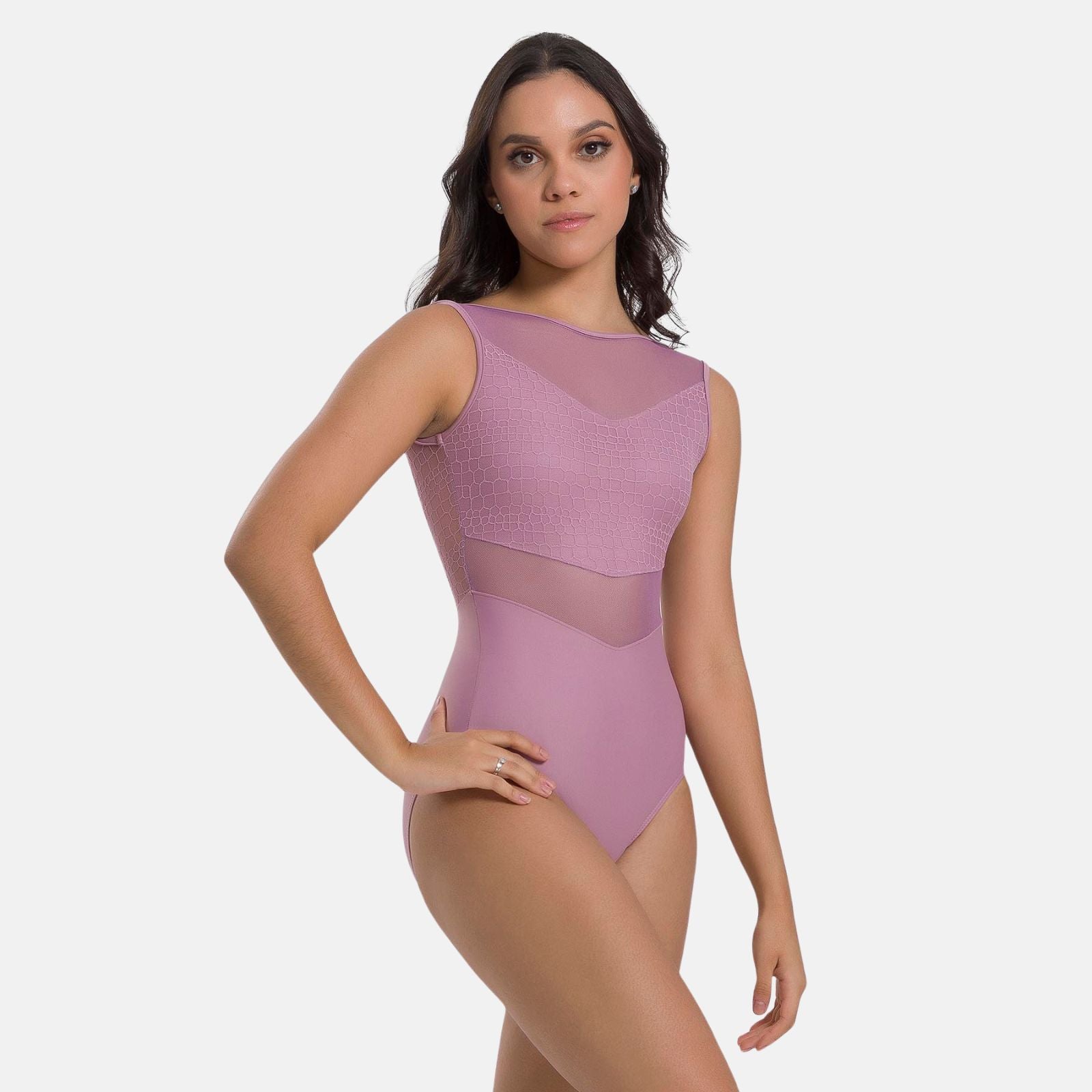Turn heads with this dramatic halter leotard featuring sheer mesh spandex panels. The combination of solid microfiber and transparent mesh creates a stunning visual effect while maintaining the support and coverage dancers need.
