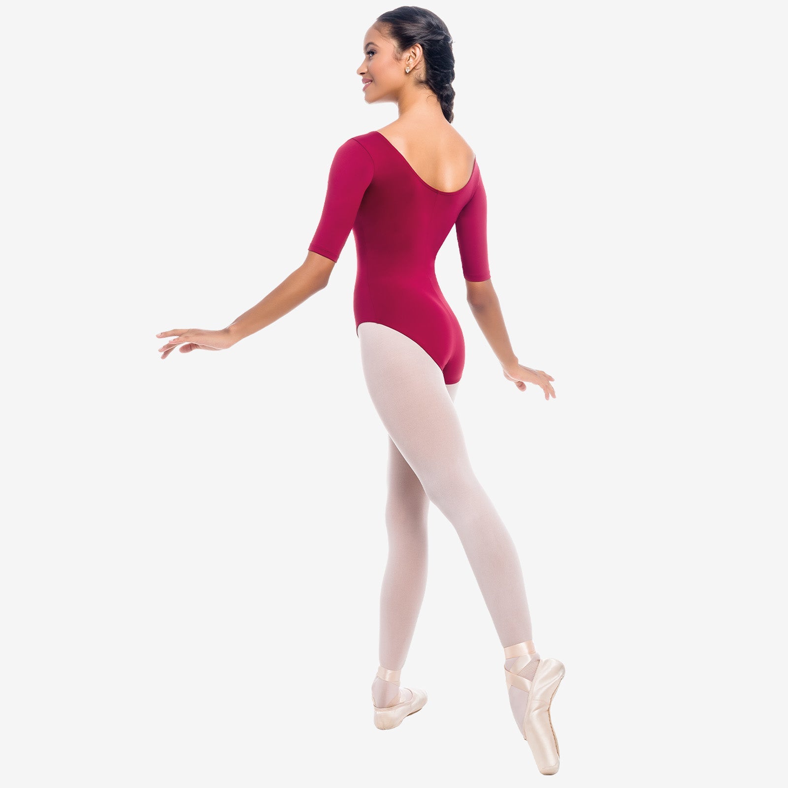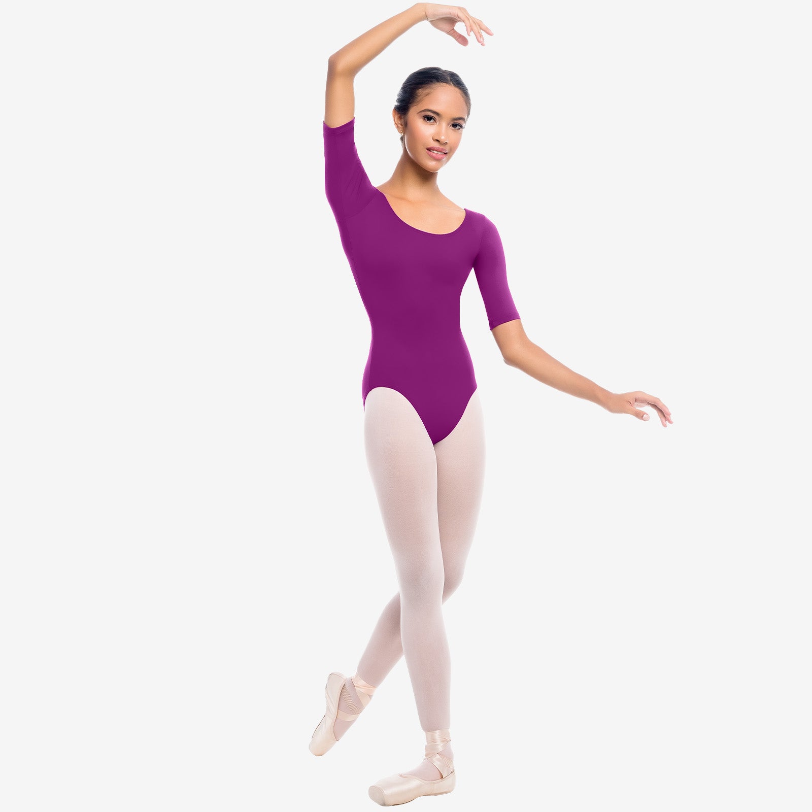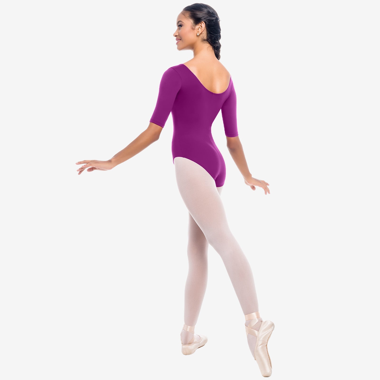 Transition from dancing to relaxing effortlessly in this microfiber half sleeve leotard. Shelf bra lining molds perfectly with a scoop neck design to accent.