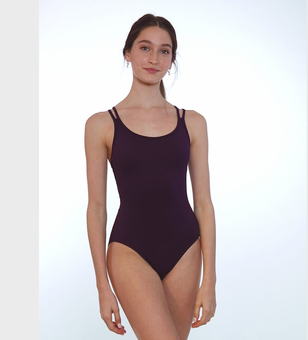 A simple, double strap camisole leotard in the front, and a star-like appearance of straps in the back. This will be a new must-have in your leotard collection!