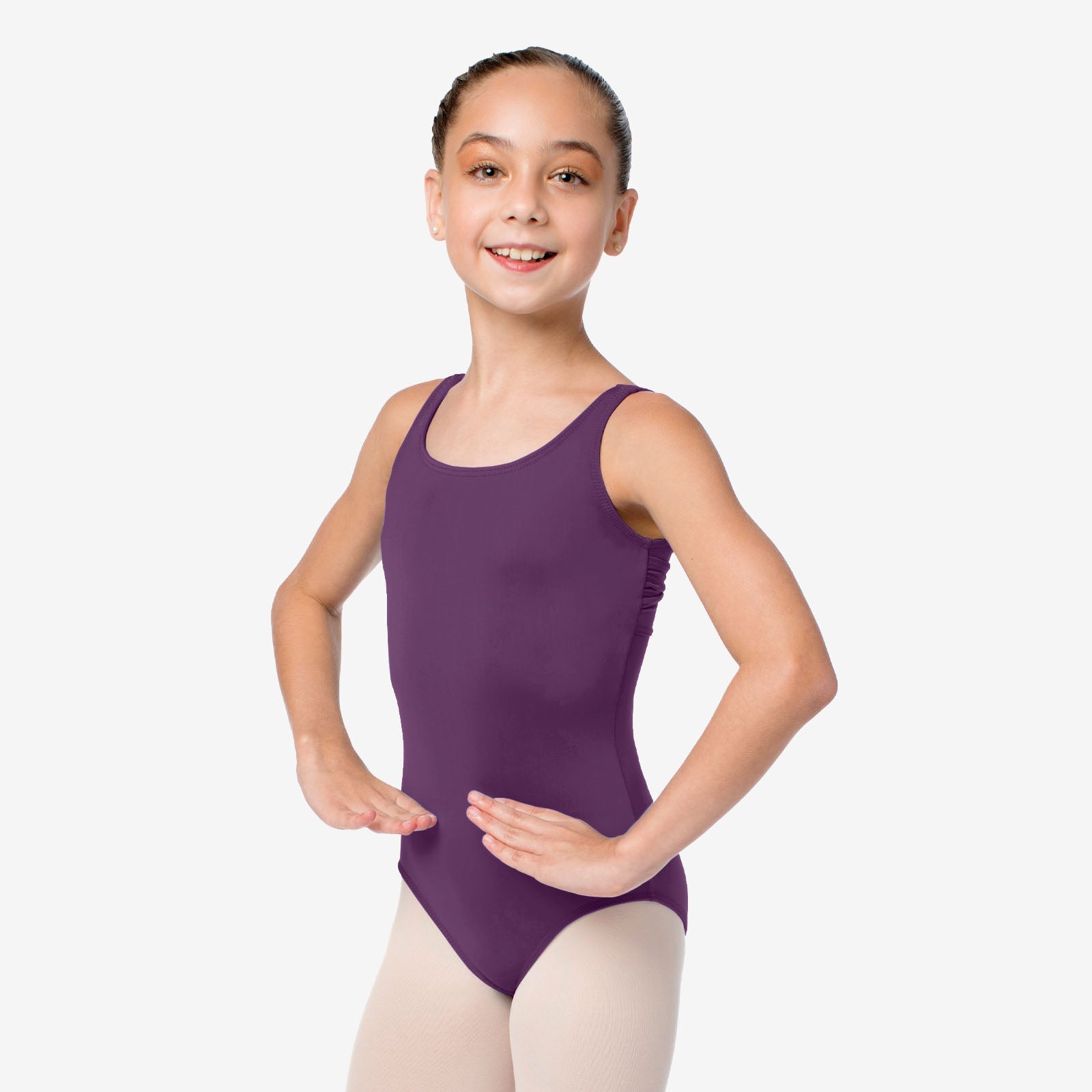 This leo is made from soft, body-hugging microfiber that has an "oh' so comfortable" fit and feel. Featuring a modest scoop neck with large gathered straps that start at the side seam, this tank is a studio classic. You’ll have coverage and control from every angle.